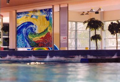 - Zum Schutz des Mosaiks gegen Beschädigung,Chlordämpfe und Feuchtigkeit wurde die Trägerscheibe mit Abstandshaltern zu einer Isolierglasscheibe mit beidseitig Einscheiben-Sicherheitsglas ( 5mm ) verarbeitet.Die Montage wurde mittels eines V 4A-Nirosta Rahmens vorgenommen.